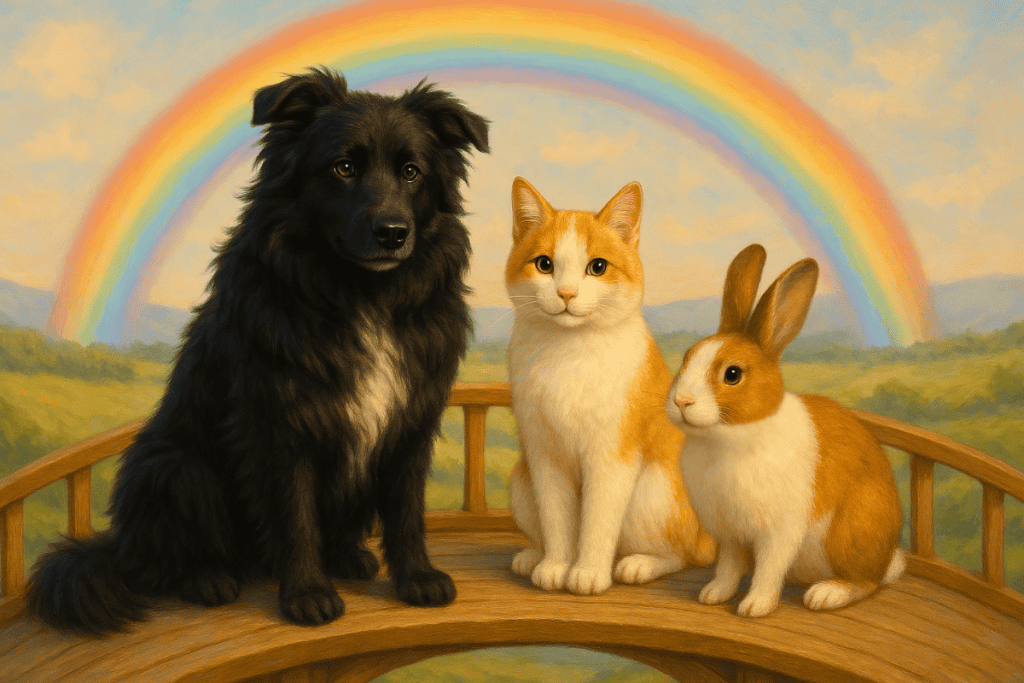 Wenn ein geliebtes Tier auf der Erde für immer eingeschlafen ist, geht es zu diesem wunderschönen Ort. Dort gibt es immer zu fressen und zu trinken, und es ist warmes schönes Frühlingswetter.