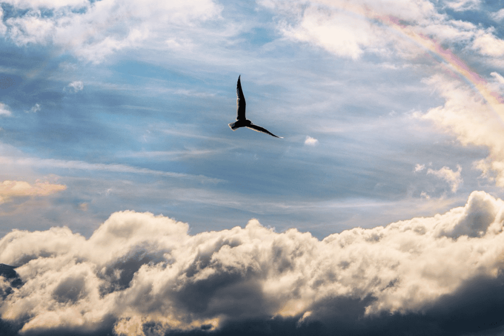 Eine Brücke verbindet Himmel und Erde. Wegen der vielen Farben nennt man sie Brücke des Regenbogens. Auf dieser Seite der Brücke liegt ein Land mit Wiesen, Hügeln und saftigen grünem Gras.